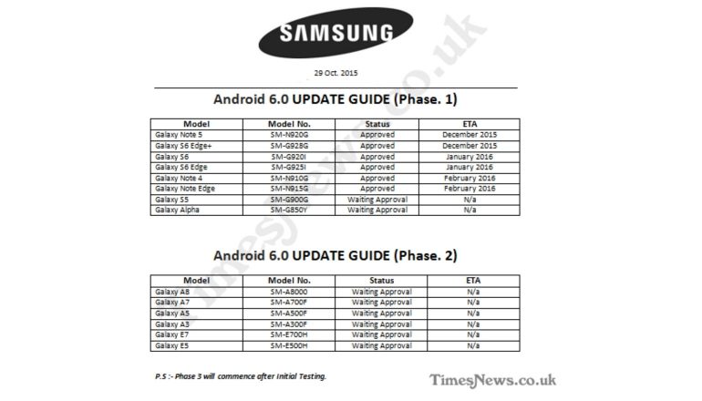 De roadmap is opgedeeld in twee fases: fase één en fase twee. In fase één zien we toestellen staan die nu al op de markt zijn uitgebracht en in fase twee zien we apparaten staan die nog moeten worden aangekondigd. In december zouden in elk geval de Samsung Galaxy S6 edge+ en Galaxy Note 5 het nieuwe Android krijgen, terwijl eigenaren van een Samsung Galaxy S6 en S6 Edge een maand langer moeten wachten. In februari zouden pas de Samsung Galaxy Note 4 en Galaxy Note Edge aan de beurt zijn. Check de lijst zelf hierboven.