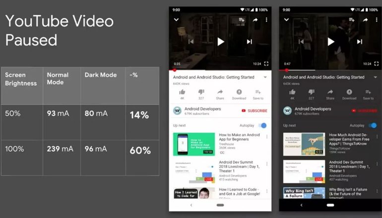 Google heeft iets bevestigd wat we stiekem allemaal allang wisten: een donkere modus (voor een app of voor heel het systeem) is goed voor de accuduur op een Android-smartphone met een oled-scherm. De individuele pixels op het scherm moeten simpelweg minder hard werken om donkere pixels te weergeven en staan bijna uit wanneer de echte zwarte kleur weergeven wordt. Dat heeft Google laten zien tijdens een presentatie op de Android Dev Summit, een jaarlijkse ontwikkelaarsconferentie. De test is gedaan op de originele Pixel-telefoon.
