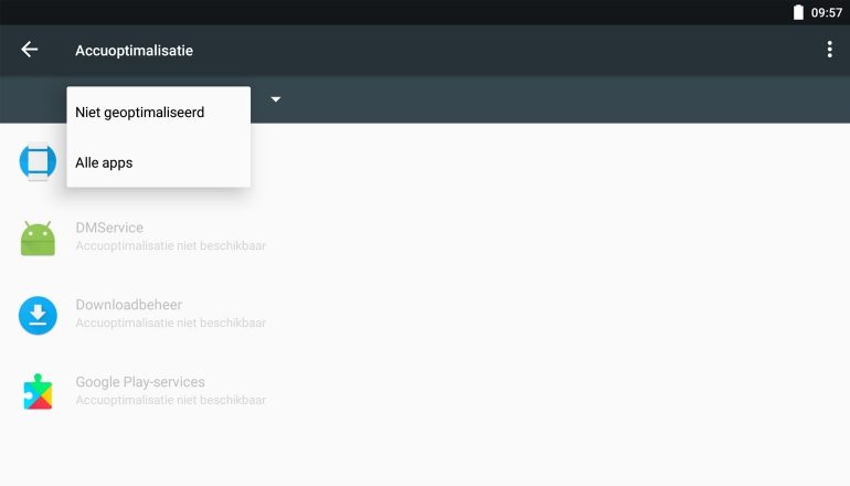 Je ziet nu een klein menu in beeld staan met de opties Niet geoptimaliseerd en Alle apps. Tap op Alle apps. Je ziet nu een complete lijst met applicaties die staan geïnstalleerd op je smartphone of tablet. Vind je dat het er wel erg veel zijn, check dan onze tips voor het verwijderen van applicaties. Scroll door de lijst totdat je de app (of apps) hebt gevonden die je wil uitsluiten van Doze. Denk bijvoorbeeld aan de berichtendiensten of e-mailapplicaties. Heb je de app eenmaal gevonden, dan selecteer je hem door een één keer op te tikken.