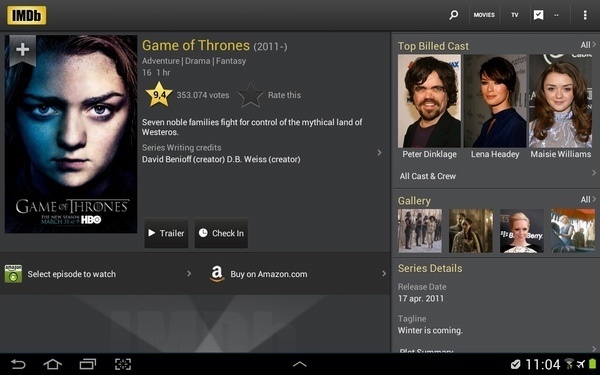 Met de IMDB app maak je van je Android tablet een database met meer dan 2 miljoen films en TV-series. Informatie opzoeken over een film of over die knappe hoofdrolspeelster? Met de IMDB app kun je uren zoet zijn. Zelf gebruik ik deze app om op de hoogte te blijven van de nieuwste films en series. Zo kijk ik zeker één keer per week even de laatste trailers om te zien wat er allemaal komen gaat.