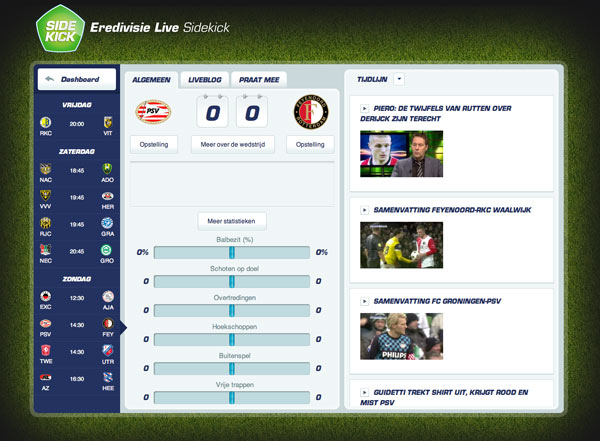 Onder meer op je tablet kun je dus simpel alle statistieken van een wedstrijd bijhouden terwijl je op je TV naar de wedstrijd kijkt. Door te surfen naar eredivisielive.nl/sidekick kom je direct in een portal terecht waar alle statistieken verschijnen zonder in te loggen of te betalen. Ook een abonnement voor Eredivisie Live is niet noodzakelijk om van de dienst gebruik te maken.