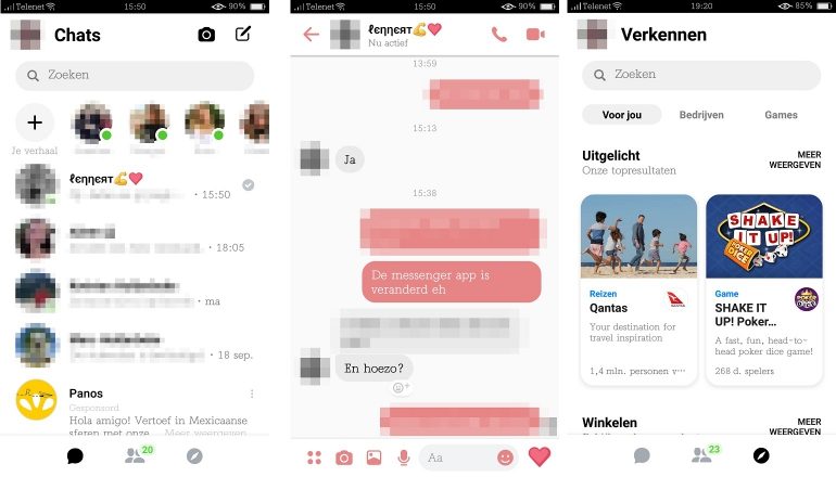 De vernieuwde app heeft drie tabbladen aan de onderkant van het scherm met de knoppen voor de camera en het starten van een nieuwe chat in de rechterbovenhoek. Facebook heeft de knoppen die we minder vaak gebruiken, zoals Games, Bedrijven en Populair voor jou onder ‘Verkennen’ (Explore) gezet. Ook het scherm voor het versturen van berichten zelf is veranderd. Volgens de gebruiker is ook de donkere modus toegevoegd. Hoe lang de test gaat duren met de nieuwe interface is nog niet bekend. Je zult dus nog even geduld moeten hebben voordat jij erover kunt beschikken. Er is geen update die je hoeft te downloaden, want deze wordt vanaf de kant van de server doorgevoerd.