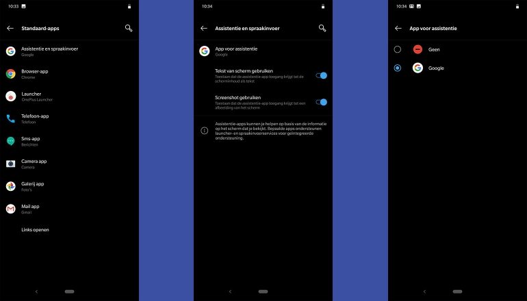 Bovenaan zie je nu Assistentie en spraakinvoer staan, met daarnaast het Google-logo. Tap daarop en kies vervolgens de optie Geen. Mocht je een andere spraakassistent geïnstalleerd hebben op je telefoon, dan kun je die ook instellen. Daarnaast laten sommige Android-apparaten het toe een andere functie of app onder de thuisknop te plaatsen, waardoor die functie geselecteerd wordt wanneer je de knop ingedrukt houdt. Selecteer in elk geval wat je precies wil veranderen. Door op de terugknop te drukken, bevestig je je keuze.