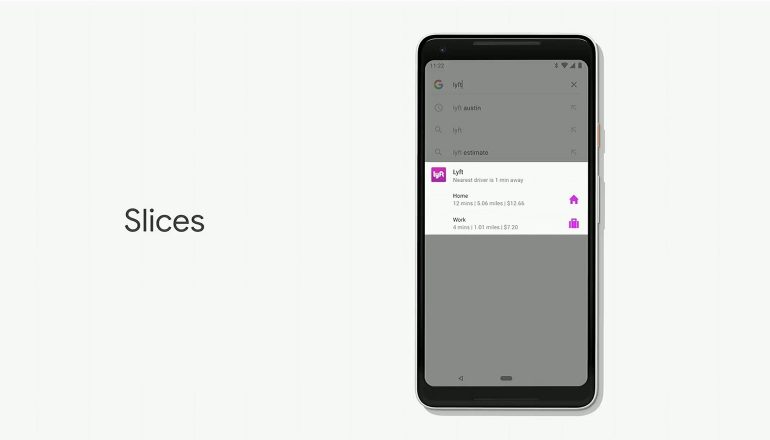 Nieuw in Android P is het deel Actions en Slices. Dit is met name interessant voor apps van externe partijen. Niet alleen kunnen zij hun diensten op een bredere manier beschikbaar stellen voor gebruikers, maar gebruikers kunnen profiteren van snelkoppelingen naar de door hun gebruikte diensten. Actions zijn in feite een soort snelkoppelingen, waarbij een gebruiker direct een dieper gelegen functie kan inschakelen van een bepaalde app. Slices zijn straks beschikbaar in de Android P-zoekbalk. Afhankelijk van de context wat je zoekt (bijvoorbeeld een lift naar huis via de getoonde Lyft-app), krijg je direct de dichtstbijzijnde bestuurder te zien en kun je deze inschakelen.