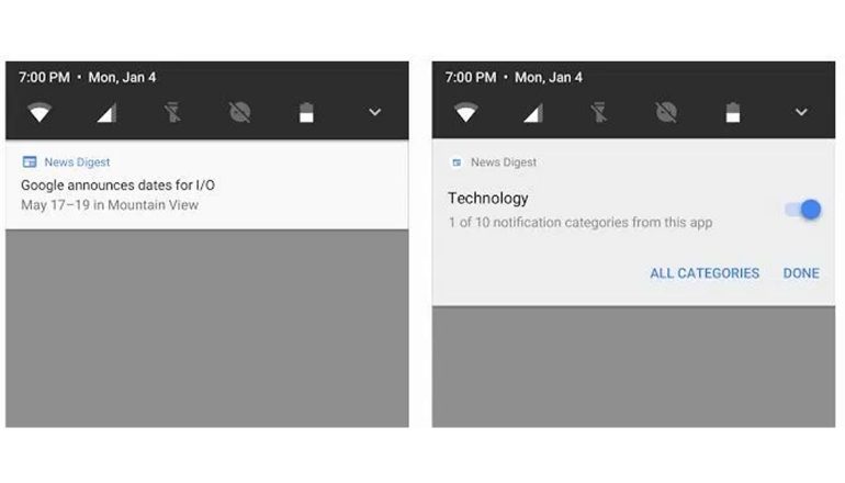 Ontwikkelaars kunnen voortaan instellen of een bepaalde notificatie binnen een specifieke categorie valt. Daardoor kunnen gebruikers in de toekomst notificaties bundelen en tegelijkertijd wegvegen. Heb je bijvoorbeeld een nieuwsapplicatie, dan kun je precies instellen over welke dingen je wel of niet een notificatie wil ontvangen. Ook kun je voor dringende zaken instellen dat je een trilling wilt voelen, terwijl minder dringende zaken geen trilling hoeven af te geven.