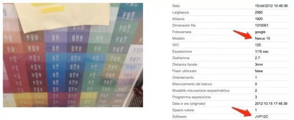 Op de website is onderstaande foto gevonden die gemaakt zou zijn met een Nexus 10 tablet, dat is althans wat de informatie naast de foto ons doet geloven. Over de tablet zelf wordt weinig gemeld, behalve dat de foto genomen is met een 5 megapixel camera en dat het apparaat draait op software versie JVP12C. Dit zou gezien eerdere data duiden op een apparaat met Android 4.1 Jelly Bean aan boord. Daar moet wel bij gezegd worden dat deze zogenaamde EXIF data vervalst kan worden als men dat zou willen.