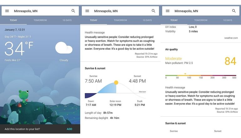 Daarnaast bieden de weerkaarten ook extra informatie aan, zoals de kwaliteit van de lucht en wanneer de zon opkomt en weer ondergaat. Ook kan er een boodschap in beeld gebracht worden voor mensen die gevoelig zijn voor bepaalde, terugkerende verschijnselen binnen de natuur. Als laatste zien we dat er drie tabs zijn: eentje voor vandaag, morgen en voor de komende tien dagen. Helaas weten we op moment van schrijven nog niet wanneer Google voornemens is de nieuwe kaarten voor iedereen te lanceren – mogelijk gebeurt dit al snel.