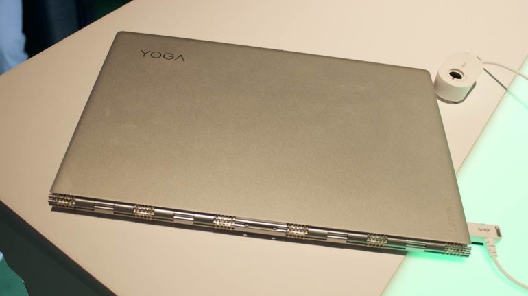 De meeste aandacht ging tijdens de presentatie uit naar het uiterlijk van de Yoga 910 en niet zonder reden. De convertible is maar 14,3 millimeter dik en kan eenvoudig in één hand vastgehouden worden. Nu zul je dat niet vaak doen maar voor onderweg is een licht gewicht ideaal. De Yoga 910 komt nog net iets strakker en chiquer over dan zijn voorganger, mede dankzij de rechte lijnen en scherpe hoeken. Ook de lichte hoek die het toetsenbord en display maken waardoor ze als een v-vorm op elkaar aansluiten draagt hier aan bij. Het display is met het toetsenbord verbonden middels de bekende ‘horlogebandaansluiting’, een zeer fraaie aansluiting die we eerder al terugzagen. Deze maakt het mogelijk het scherm soepel 360 graden te draaien en zo het apparaat in verschillende modi te zetten.
