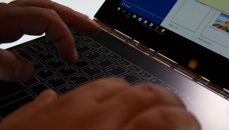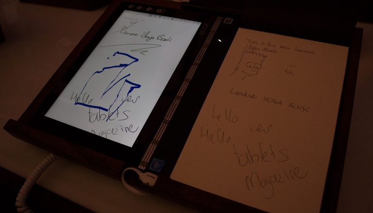 De Lenovo Yoga Book is een vreemde eend in de bijt. Het is een tablet en een laptop, maar ook een apparaat waar je prima op kunt tekenen of handgeschreven berichten op kwijt kunt. Op de bovenstaande foto kun je bijvoorbeeld zien hoe het toetsenbord eruitziet. Zo op het eerste gezicht lijkt er niets ‘anders’ te zijn, maar dat is het wel degelijk. De toetsen zijn namelijk digitaal en compleet plat. De fabrikant noemt dit het Holo-toetsenbord, waarschijnlijk omdat de knoppen op het oppervlak iets weghebben van een hologram.
