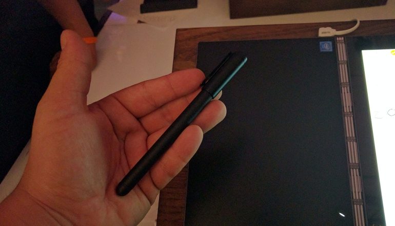 De Yoga Book is dicht 9.6mm dun en weegt 690 gram, wat hem eenvoudig mee te dragen maakt. De behuizing is gemaakt van een combinatie van magnesium en aluminium. Het scherm is 360 graden te draaien waardoor je het geheel in diverse posities – als tablet, als laptop en alles daar tussenin – kunt gebruiken. De pen hoeft nooit opgeladen te worden, beschikt over 2.038 drukniveaus en je kunt de tip van de normale pen door elke andere pentip vervangen. Het scherm is 10,1-inch groot en beschikt over een resolutie van 1920 bij 1200 pixels.