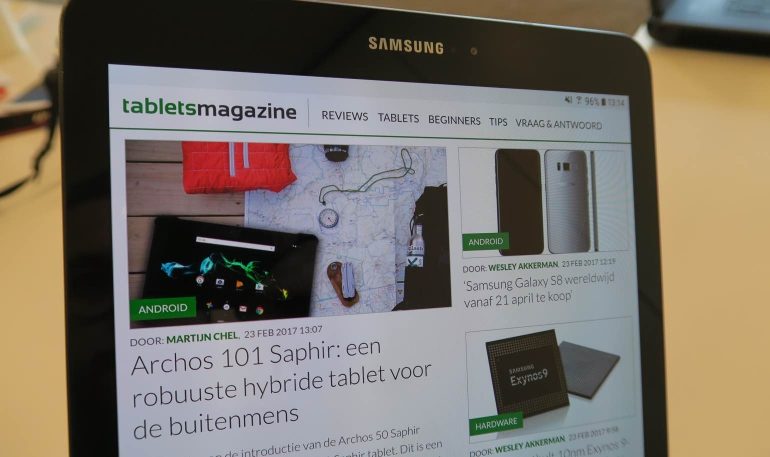 De achterkant heeft Samsung uitgerust met een 13 megapixel camera met autofocus en led-flitser, aan de voorkant kom je een 5 megapixel camera tegen. De camera’s hebben we niet héél uitgebreid getest, maar zo op het eerste gezicht is de fotokwaliteit boven gemiddeld goed voor een tablet. Natuurlijk zaten wij in een goed verlichte ruimte mét ramen – ideale omstandigheden dus. De vraag is echter of je een tablet voor het maken van foto’s of video’s zult gebruiken.