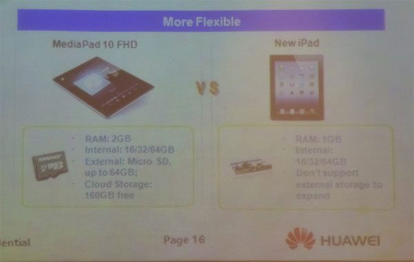 In de foto’s die Wood op Flickr geplaatst heeft wordt de MediaPad 10 FHD naast de nieuwe iPad (3) gehouden om de kwaliteit van het display en het zeer fraaie design te tonen. Het display heeft een resolutie van 1.920 bij 1.200 pixels en zou volgens Huawei dichtbij de kwaliteit van het Retina display moeten komen. Ook het design heeft veel weg van de iPad. Zo beschikt de tablet over een unibody design met een geborsteld aluminium afwerking. Verder wordt de tablet naast de iPad gelegd om het verschil in dikte, gewicht en de processor aan te tonen. Huawei zet de MediaPad 10 FHD dus absoluut in als direct concurrent van de iPad.