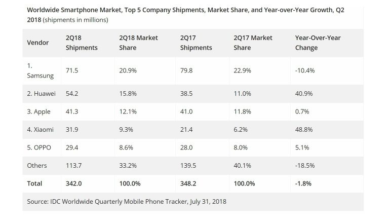 Al jaren staat Samsung op de eerste plek als het gaat om verscheepte exemplaren, gevolgd door Apple op de tweede plek. Onderzoeksbureau IDC heeft de resultaten naar buiten gebracht voor het tweede kwartaal van 2018. Ook deze keer blijft Samsung nog altijd ruim bovenaan staan met 71,5 miljoen verscheepte exemplaren, goed voor een marktaandeel van 20,9%. Het bedrijf laat wel een flinke daling zien. In hetzelfde kwartaal vorig jaar ging het om 79,8 miljoen verscheepte exemplaren en een marktaandeel van 22,9%. Dit betekent een daling van 10,4%.