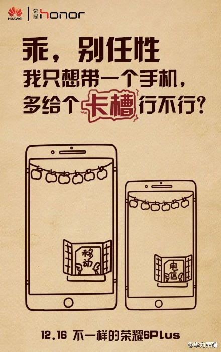 We hebben hem al eens eerder voorbij zien komen: de Huawei Honor 6 Plus-phablet, die op 16 december van dit jaar wordt aangekondigd. Maar fabrikant Huawei is niet vies van een beetje plagen en gooide zelf een digitale poster online, met helaas weinig onthullende dingen. Op die poster zien we onder andere de Honor 6 Plus staan, samen met de datum – ons Chinees is verder niet goed genoeg om te vertellen wat er nog meer op staat, maar het zal vast en zeker te maken hebben met de officiële aankondiging van de phablet.