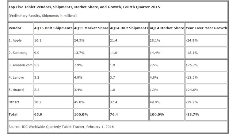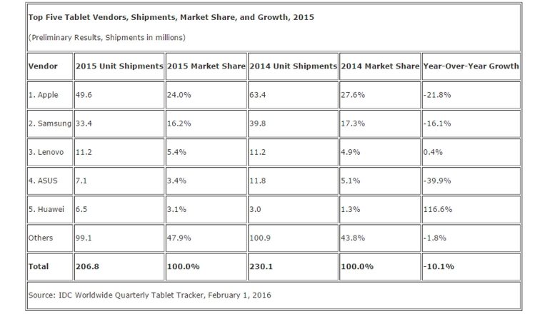 De markt voor tablets zit nog steeds in een neerwaarts spiraal. Het vierde kwartaal van 2015 is het vijfde kwartaal op rij waarin een slecht resultaat geboekt is als het om verscheepte tablets gaat. In dat kwartaal zijn er 65,9 miljoen apparaten verscheept, tegenover 76,4 miljoen een jaar eerder; dat is een daling van 13,7 procent. In een jaar tijd moest de tabletmarkt iets minder inleveren: zo’n 10,1 procent, in vergelijking met 2014. In 2015 zijn er 206,8 miljoen devices verscheept, terwijl dat aantal in 2014 nog op 230,1 miljoen lag.