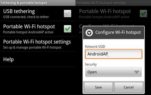 Ha naar het Instellingen menu en kies de tab ‘Draadloos en netwerken’. In dit menu kun je, afhankelijk van de Android versie die je gebruikt, een optie voor tethering of Hotspot aanzetten. Ga naar de instellingen van deze optie en kies een naam en wachtwoord voor het op te zetten netwerk.