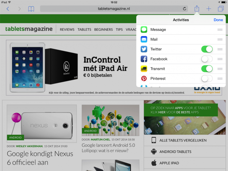 Met iOS 8 hebben ontwikkelaars van apps meer vrijheiden gekregen. Vroeger was het vrijwel onmogelijk om een document uit de ene app te openen in de andere app. Nu gaat dat erg gemakkelijk. Als je bijvoorbeeld in Safari op de iPad op het deel-icoontje tikt, zie je boven de oude opties zoals bookmark toevoegen of de URL kopiëren, nieuwe opties. Door naar links te scrollen kun je zelf bepalen welke apps je wilt weergeven.
