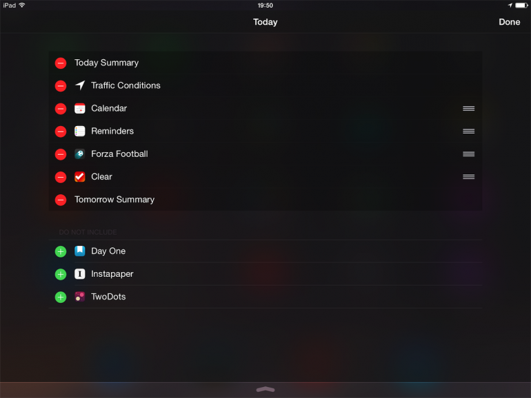 Android kende ze al, maar voor Apple gebruikers zijn ze nieuw: widgets. Dit zijn stukjes van apps die updaten zonder dat je de app hoeft te openen. Zo kun je met de Forza widget, van de gelijknamige app Forza, live de scores van voetbalwedstrijden bekijken zonder de app te openen. De widgets leven in het notificatie-paneel, dat opent je door met je vinger van de bovenkant van het scherm naar onder te bewegen. Ga vervolgens naar vandaag, en tik op wijzigen. Nu kun je kiezen welke widgets je wel en welke niet wilt zien.