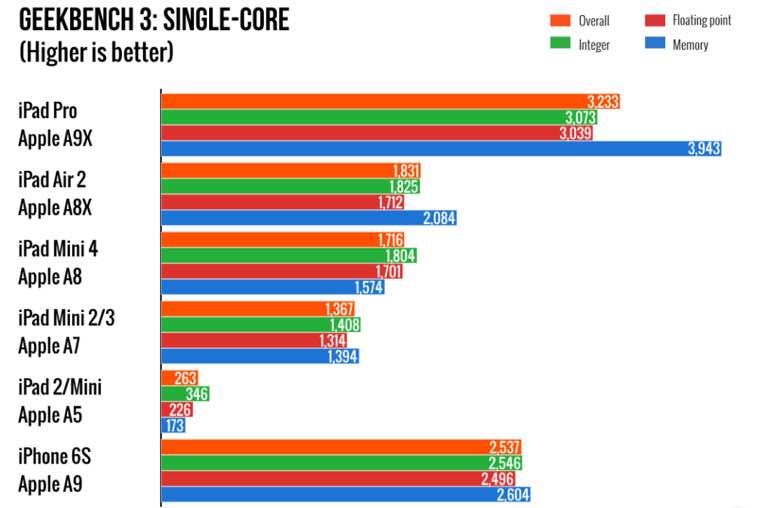 Ars Technica legde de nieuwe tablet op de pijnbank en concludeerde dat de beweringen van Apple over de iPad Pro aardig kloppen. In sommige benchmarktests winnen de duurste en nieuwste retina MacBook Pro-laptops het nog op onderdelen van de tablet, maar in veel andere vergelijkingen komt de iPad Pro zegevierend over de finish. De iPad Pro is in ieder geval op vrijwel alle vlakken beter dan de 12-inch MacBook, beter dan de iPad Air 2 en ook sneller dan de meeste nieuwe iPhones.