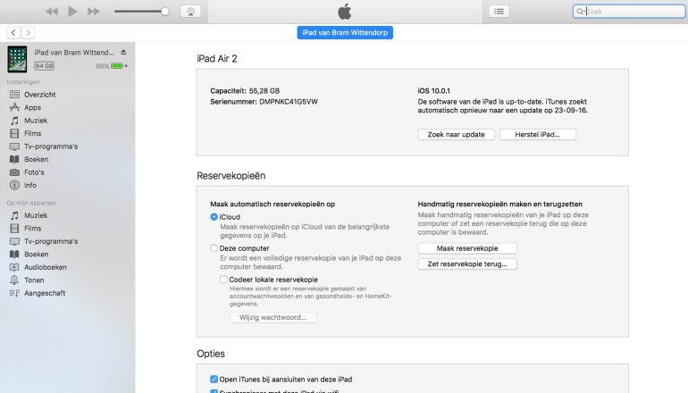 Het is ook mogelijk om je iPad of iPhone te resetten via iTunes, koppel daarvoor het toestel met de meegeleverde kabel aan je computer en open iTunes. Als je toestel nog niet eerder gebruikt hebt met een computer dan zul je de computer eerst moeten vertrouwen via het toestel. Resetten doe je via de knop ‘Herstel iPad…’. Je dient echter wel eerst op je apparaat in Instellingen >> iCloud >> Zoek mijn iPad/iPhone uitgeschakeld te hebben. Een voordeel van resetten via iTunes is dat je de mogelijkheid hebt om direct een reservekopie te maken op je computer.