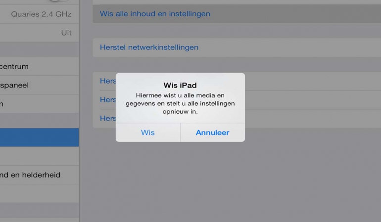 Met de optie ‘Wis alle inhoud en instellingen’ wis je echt alles en zet je je iPad dus terug naar de fabrieksinstellingen. Zo is je tablet klaar om te verkopen of klaar voor een ander lid in het gezin.