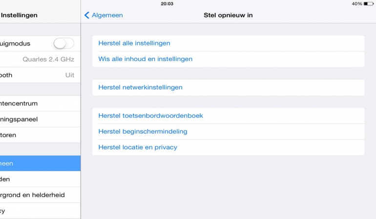 - Herstel alle instellingen: Hiermee wis je alle instellingen. Dingen zoals video’s, foto’s en apps blijven allemaal gewoon op je iPad staan.