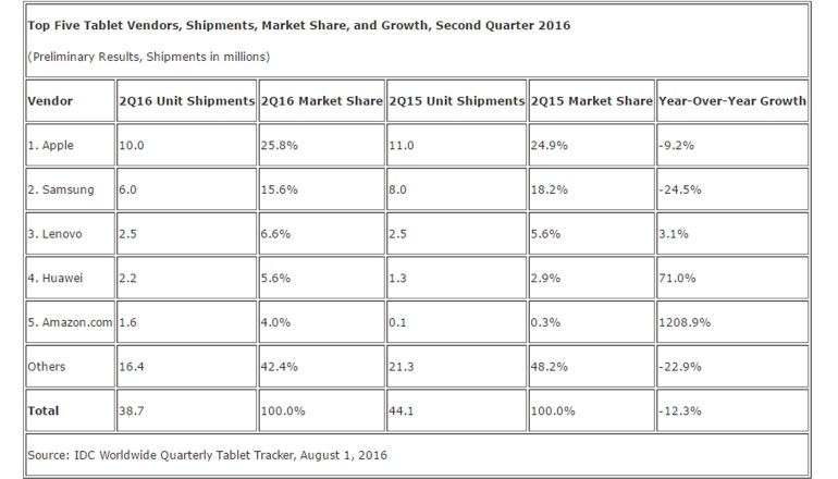 De markt voor tablets is voor het zevende kwartaal op rij gedaald. Het tweede kwartaal van 2016 laat een daling van 12,3 procent zien ten opzichte van dezelfde periode vorig jaar als het gaat om het aantal verscheepte exemplaren: van 44,1 miljoen naar 38,7 miljoen. Deze cijfers nemen ook hybrides mee in de telling. Android heeft wel een groot marktaandeel in handen: 65 procent. iOS moet het doen met 26 procent, terwijl Windows de overige negen procent oppakt. Maar er is wel een stijging zichtbaar voor Windows-tablets.