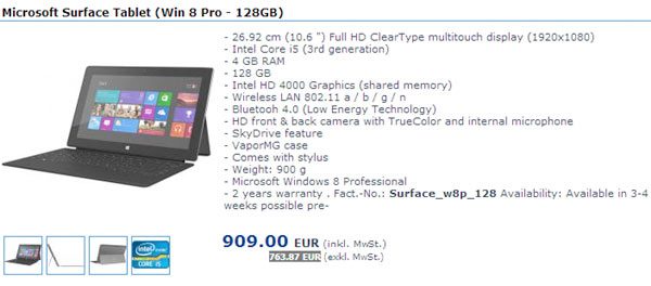 De Microsoft Surface voor Windows 8 Pro met 64GB aan SSD opslaggeheugen zou in Duitsland een prijs van ruim 800 euro krijgen. Wil je 128GB aan opslaggeheugen dan komt hier nog ruim 100 euro bij. Het is echter niet duidelijk of je er voor deze prijs een keyboard cover bij krijgt. De winkel waar de tablet reeds te bestellen zijn geeft aan dat de levertijd op 3 tot 4 maanden staat wat inhoudt dat de tablet ergens begin volgend jaar op de markt moet verschijnen.