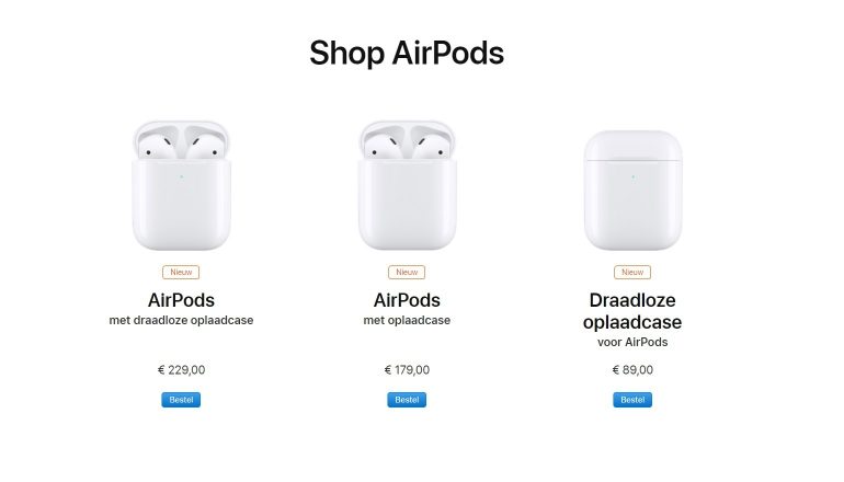 Volgende week moeten de nieuwe Apple AirPods op de markt verschijnen. Op de website van Apple staan de prijzen alvast weergegeven en kun je ze alvast kopen en laten bezorgen tussen 26 en 28 maart. De nieuwe AirPods met draadloze oplaadcase zullen 229 euro gaan kosten. Wil je liever de nieuwe AirPods met gewone oplaadcase? Dan zul je hiervoor 179 euro moeten betalen. De draadloze oplaadcase is ook los verkrijgbaar voor een bedrag van 89 euro. Over de AirPower-oplaadmat werd overigens niet gesproken. De nieuwe AirPods draaien op iOS 12.2, watchOS 5.2 of macOS 1.014.4. Het lijkt er dus op dat we komende week nog een aantal updates gaan krijgen.