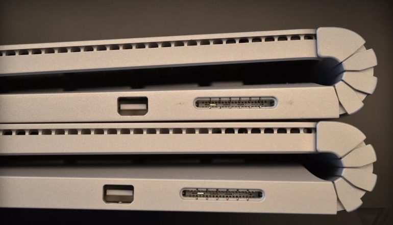 The Verge is hier achter gekomen door de oude en de nieuwe Surface Book op elkaar te plaatsen en ze vanaf de zijkant op de foto te zetten. Uit het plaatje blijkt duidelijk dat de opening tussen klavier en scherm een stukje is verkleind. Dat is gunstig, want zo kan er minder vuil tussen komen.