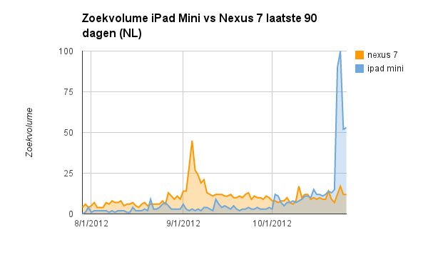 Ook als we alleen naar iPad Mini vs. Nexus 7 kijken zien we dat het Nederlandse zoekvolume de laatste 90 dagen duidelijk wijst op interesse voor de iPad Mini. Vanaf het moment (rond 2 oktober) dat er geruchten kwamen over de uitnodigingen van Apple voor een ‘iPad Mini event’ zien we dat de interesse voor deze tablet die van de Nexus 7 al evenaart. Nu de iPad Mini ook daadwerkelijk is aangekondigd is in het verschil van de toppen in de grafiek ook weer duidelijk dat Apple producten populair zijn bij Nederlanders.