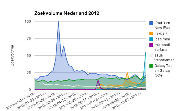 In bovenstaande afbeelding is duidelijk te zien dat er bij de Nederlandse zoekers die Google gebruiken er een hoop interesse is voor Apple producten. De iPad Mini is op dit moment de populairste tablet om op te zoeken en hoeft wat betreft 2012 alleen de vorige versie van de iPad voor zich te dulden. De Nexus 7 is ook redelijk populair maar komt uiteindelijk niet echt in de buurt van de massale interesse van het Nederlands publiek voor Apple producten.