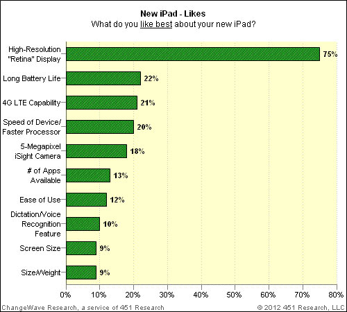 ChangeWave heeft ook gekeken naar wat de ondervraagden dan zo goed vonden aan hun iPad. Niet geheel onverwachts is het Retina display de grote winnaar. 75 procent van de ondervraagden geeft aan dat dit de beste feature van de nieuwe iPad. De batterijduur staat op de tweede plek met 22 procent en de 4G ondersteuning staat op nummer drie met 21 procent. Gezien de kritieken die voorbij komen over het warm worden van de nieuwe iPad vroeg men ook of gebruikers hier problemen mee hebben. Geen enkele deelnemer aan het onderzoek gaf aan dat het een ‘heel groot probleem’ is, 4 procent gaf aan dat het ‘een probleem’ is en 7 procent vind de warmer wordende tablet eigenlijk niet echt een probleem. De overige 89 procent vindt alle kritieken onzin omdat ze het niet ervaren hebben of gewoon geen probleem vinden.