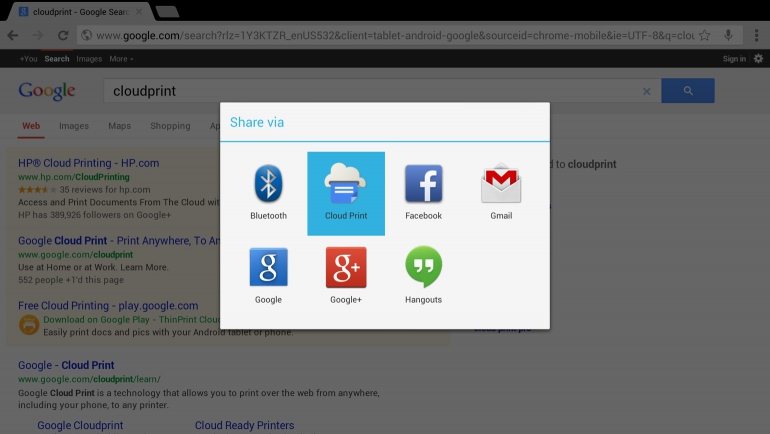 Om deze optie te gebruiken start je de Chrome-browser op om vervolgens naar de instellingen en geavanceerde instellingen te gaan. Hier vind je Google Cloudprinter en kun je een printer toevoegen. Vervolgens log je in op je Google account en krijg je een bevestiging voor het toevoegen van de printer die op je computer aangesloten is. Chrome dient vanaf u als tussenstap tussen printer en mobiel apparaat. Wanneer je iets print vanaf je Android tablet stuur je de data naar Google Cloudprinter, welke het weer doorstuurt naar Chrome. Chrome stuurt vervolgens de gekoppelde printer aan. De voorwaarde is dus dat je computer aanstaat, gekoppeld is met het internet en dat je in Chrome ingelogd bent op je Google account.