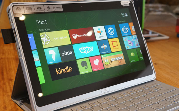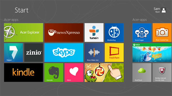Om je op weg te helpen heeft Acer alvast een paar apps voor je geïnstalleerd in de moderne omgeving van Windows 8. Je vind onder andere apps voor het lezen van magazines, boeken en RSS feeds. Ook Skitch, TuneIN Radio, Evernote, Music Maker Jam, Weatherbug, Freshpaint en Cut the rope zijn alvast geïnstalleerd. In de desktopomgeving vind je een paar apps die communiceren met de Acer Cloud en natuurlijk de altijd vervelende trial van McAfee Internet Security.