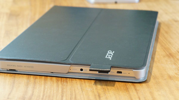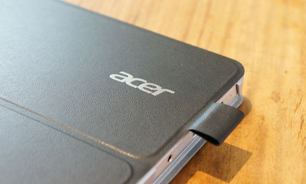 De Aspire P3 klikt vast in een zilverkleurig plastic frame dat aan het vinyl gelijmd is. De tablet kan in een hoek gezet worden en een opstaand randje past perfect in de daarvoor bestemde ruimte in het toetsenbord-gedeelte. De positie die je daarmee creëert is stevig en werkt goed, helaas kan je de hoek niet veranderen in situaties waar je teveel last van weerspiegelingen hebt. Opvallend is ook dat er geen uitsparing is vrijgehouden voor de camera aan de achterkant van de Aspire P3, niet dat je heel veel mist. Toch geeft een dergelijke keuze een aanwijzing dat er meer aandacht aan de hoes besteed had mogen zijn.