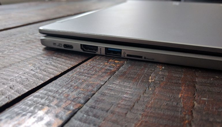 Aan de linkerkant zitten vier aansluitingen: een micro-sd-kaartsleuf, een usb-poort, een poort voor de hdmi-kabel en een opening voor de usb-type-c-kabel. Door de toevoeging van de reguliere usb-poort is het bijvoorbeeld mogelijk oudere muizen (en toetsenborden) aan te sluiten, die vrijwel meteen herkend worden door de Chromebook. Rechts zitten de volumeknoppen en de knoppen voor het in- en uitschakelen van de R 13, evenals de aansluiting voor een koptelefoon. Ook vind je er de indicatielampen van de accu en de standby-stand.