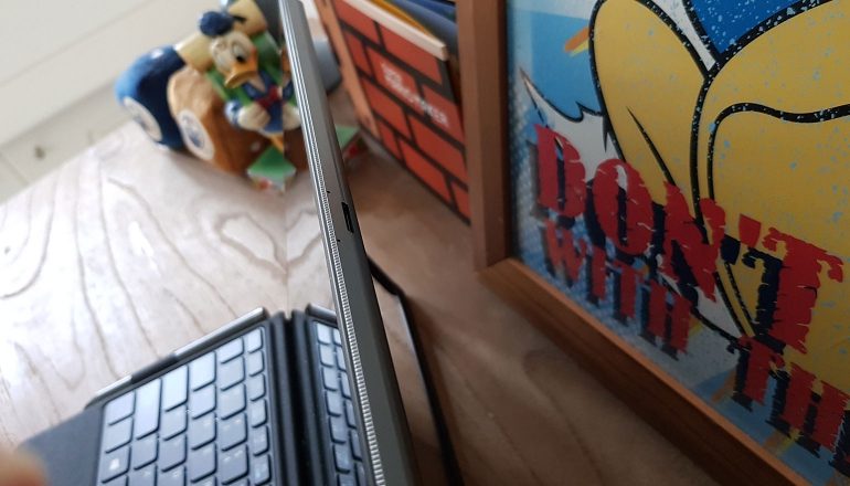 Bovendien is het zo dat het toetsenbord is voorzien van achtergrondverlichting. En dat is dan weer handig voor de mensen die niet blind typen, maar wel in de avond willen werken. Het geeft de tablet ook een luxueuze uitstraling mee. De trackpad zit niet helemaal in het midden, maar dat is voor je pols juist beter. Daarnaast is het oppervlak groot en glad, waardoor je er moeiteloos overheen glijdt. Trage bewegingen worden helaas niet altijd geregistreerd, maar dat is dan ook het enige probleem met het toetsenbord.