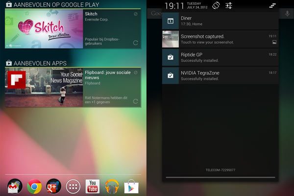 In de volledige review ga ik verder in op de software van de Nexus 7 tablet. Voor nu hou ik het erbij dat de tablet draait op Android 4.1 Jelly Bean, de nieuwste versie van Android, met natuurlijk alle Google applicaties en functies die je zou verwachten, zoals toegang tot de Google Play Store. Een belangrijke verandering ten opzichte van Android 4.0 Ice Cream Sandwich die gelijk opvalt is de interface voor 7 inch tablets. Google heeft namelijk voor deze kleinere tablets het homescreen vastgezet in portrait modus (verticaal) met de notificatiebalk bovenin. Je kunt de Android homescreens dan ook niet horizontaal gebruiken. Dit kennen we van de Android smartphones.