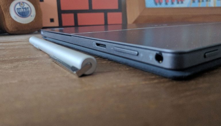 Uiteraard is de kickstand in allerlei hoeken te gebruiken. Zo is het mogelijk het scherm in een hoek neer te zetten waardoor het voor jou gemakkelijk wordt iets uit te typen. Ook kun je het scherm alleen rechtop plaatsen en zo bijvoorbeeld een video bekijken. Mocht je het prettig vinden op het touchscreen te typen, dan is het ook mogelijk een bepaalde hoek aan te nemen — maar pas dan wel op voor het gebrek aan grip. We raden aan wanneer je zoiets doet, je de kickstand inklapt en de tablet plat op tafel legt voor de beste schrijfervaring.