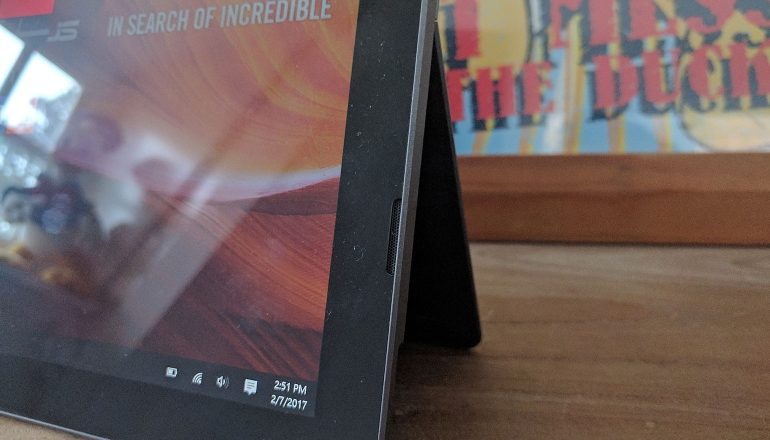 Opvallend zijn de openingen aan de bovenkant. Die openingen zijn er voor het ventileren van de warme lucht. Omdat de tablet beschikt over een krachtige processor in een ontzettend dunne behuizing, kan het voorkomen dat ‘ie snel warm wordt en dus z’n lucht kwijt moet. Dat brengt behoorlijk wat lawaai met zich mee, wat op ten duur best kan gaan irriteren. Het is geen geluid waar je niet aan zou kunnen wennen, maar het is een geluid dat je liever niet hoort wanneer je aan het werk bent of wanneer je gewoon een video aan het bekijken bent.
