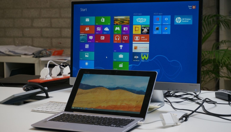 De Asus Transformer Book Trio wordt geleverd met Windows 8 maar de Windows 8.1-update is ondertussen ook beschikbaar en kan dus direct geïnstalleerd worden. Hoewel de update van Windows als vrij fors omschreven mag worden is er in de basis niet heel veel veranderd. Er bestaan nog steeds ‘twee werelden’ in Windows 8.1; de moderne omgeving met de tegeltjes en de apps die fullscreen draaien (of in ieder geval starten) en de desktopomgeving waar de traditionele/legacy software geïnstalleerd kan worden.