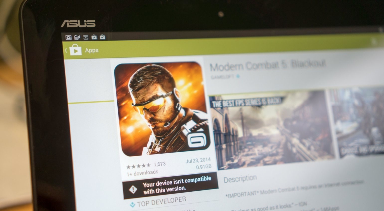 De tablet is niet supersnel, maar snel genoeg voor alle basistaken, inclusief het browsen op het internet. Voor gaming is deze tablet wat minder geschikt. Simpele spelletjes moeten kunnen, maar helaas worden moderne en grafisch intensieve games vaak al te lastig voor de Asus Transformer Pad TF103C. En in sommige gevallen, zoals bij de hieronder weergegeven nieuwe Modern Warface-app, is de hele tablet (processor) niet eens ondersteund.