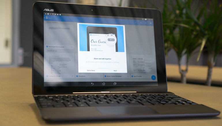 Ik heb een paar weken lang deze Asus Transformer Pad TF103C op mijn bureau gehad, en aanzien mijn laptop vast zit aan een extern scherm en een harde schijf is het best een gedoe dat ding steeds los te trekken. Vaak neem ik dus mijn iPad mee als ik even snel met iemand moet gaan zitten, maar sinds ik dit apparaat op mijn bureau heb liet ik de iPad vaak genoeg even loggen. Vooral het toetsenbord van Asus’ nieuwe hybride is een handige toevoeging in het geval dat je wat notities moet maken.