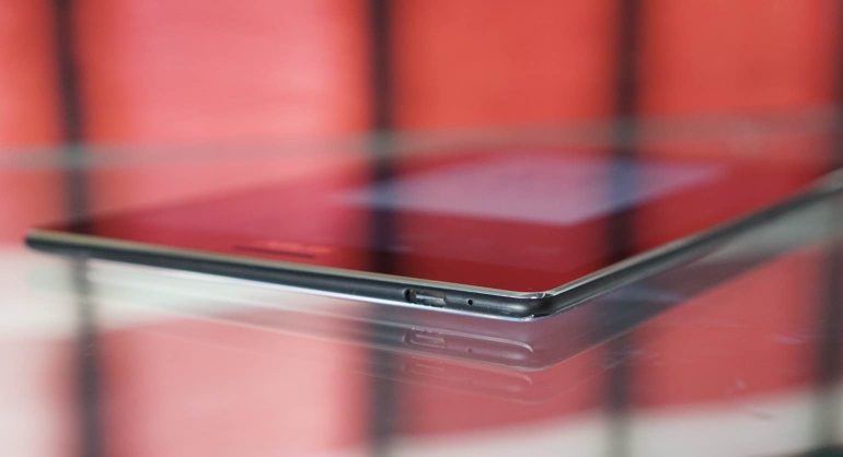 De usb type-c-aansluiting vind je aan de korte kant onderaan, en is opvallend genoeg niet in het midden maar rechts geplaatst. De volume- en aan/uit knop zit aan de lange rechter zijkant en de microSD-kaartlezer vind je daar tegenover, onder een klepje.