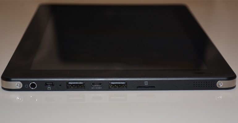 De bovenkant is gehuld in een chroomkleurige metalen strip, met daarin verwerkt de powerknop en de langwerpige volumeknop. De onderkant heeft ook zo’n metalen strip, met openingen en aansluitingen voor het optionele toetsenbord, waarover later meer. De linkerzijkant bevat van links naar rechts flink wat aansluitingen: voor de 3,5 mm oortelefoon, een micro-hdmi poort, een volwaardige usb 2.0 poort, een micro usb-poort, nog een volwaardige usb 2.0-poort, en een sleuf voor een micro sd-kaart. De onderkant van de korte zijkanten bevatten stereospeakers.