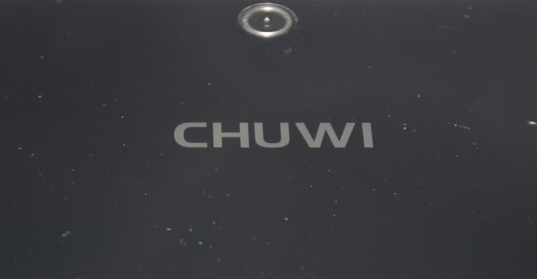 Op de achterkant valt niet veel te beleven. We zien hier de achtercamera, die zich hier wel precies in het midden bevindt. Misschien kreeg Chuwi het niet voor elkaar om beide cameramodulen precies tegenover elkaar te plaatsen zonder de tablet flink dikker te maken. En het is al een dikkerdje in de huidige markt. Onder de camera zien we in zilver het Chuwi-logo, en aan de onderkant de logo’s van Intel en nog wat FCC-informatie. Ook de achterkant is van glas, beschermd door een plastic screenprotector, net als het scherm.