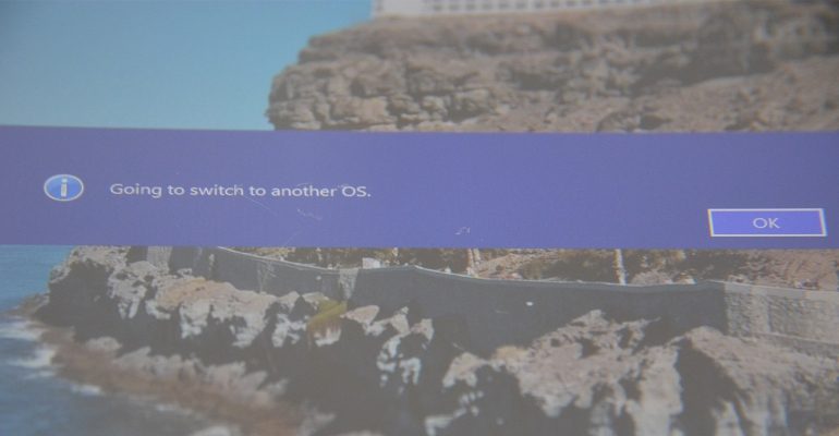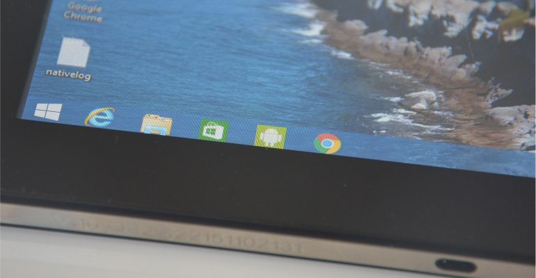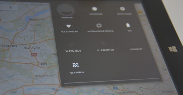 De beide besturingssystemen zijn natuurlijk het meest bijzondere kenmerk van deze tablet. Windows 8.1 is standaard het besturingssysteem dat in beeld komt als je de tablet aan zet, maar het is ook mogelijk om in Android 4.4.4 te booten. Omschakelen tussen beide besturingsssytemen vergt slechts een seconde of twintig, dertig en gaat erg eenvoudig. Onder Windows bevindt zich in de startbalk aan de onderkant van het scherm een Androidlogo. Druk daarop, en je krijgt na een bevestigingsvenster een reboot waarna het apparaat opnieuw opstart onder Android. Ben je in Android en wil je weer terug naar Windows, dan hoef je alleen maar het rechter rolmenu omlaag te trekken, waar je de optie tegenkomt om weer onder Windows op te starten. Een kind kan de was doen.