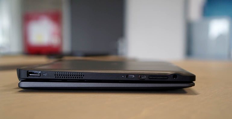 De verbinding gaat via een een paar uitstekende delen en een magneet om de boel op z’n plaats te houden. Het toetsenbord dock is niet voorzien van extra poorten en ook geen extra accu. Het scharnier is dubbelzijdig, dus je kunt de tablet er ook ‘verkeerd’ om in zetten. Dell noemt die een stand-modus, wij noemen het een beetje vergezocht.