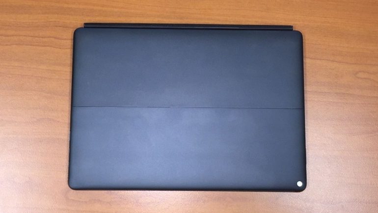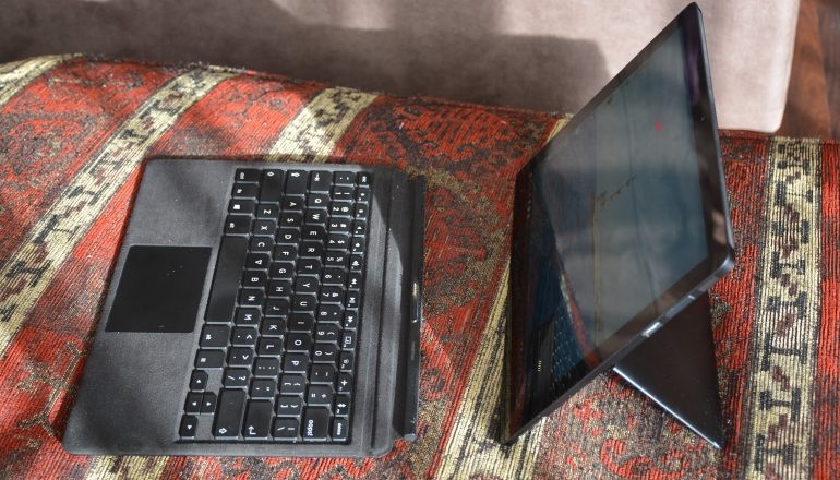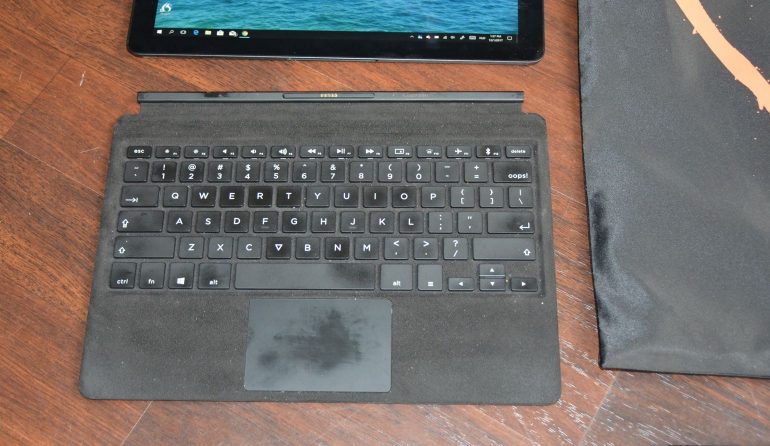 Het toetsenbord wordt via vier pogopins aangesloten onderaan de tablet. Het kan dan lichtelijk worden opgetild, zodat het licht hellend tegen de tablet aan staat. Dan heb je een laptop tot je beschikking. Klik je de pogopins los, dan vraagt Windows je of de tablet in tabletmodus moet worden gezet. En klik je hem weer vast, dan wordt het keyboard direct weer herkend.